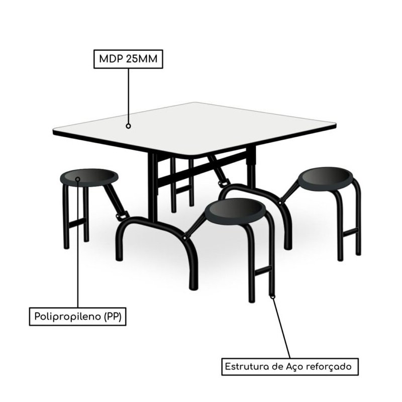Mesa para Refeitório ESCAMOTEÁVEL 04 Lugares – MDP BRANCO DE 25 MM